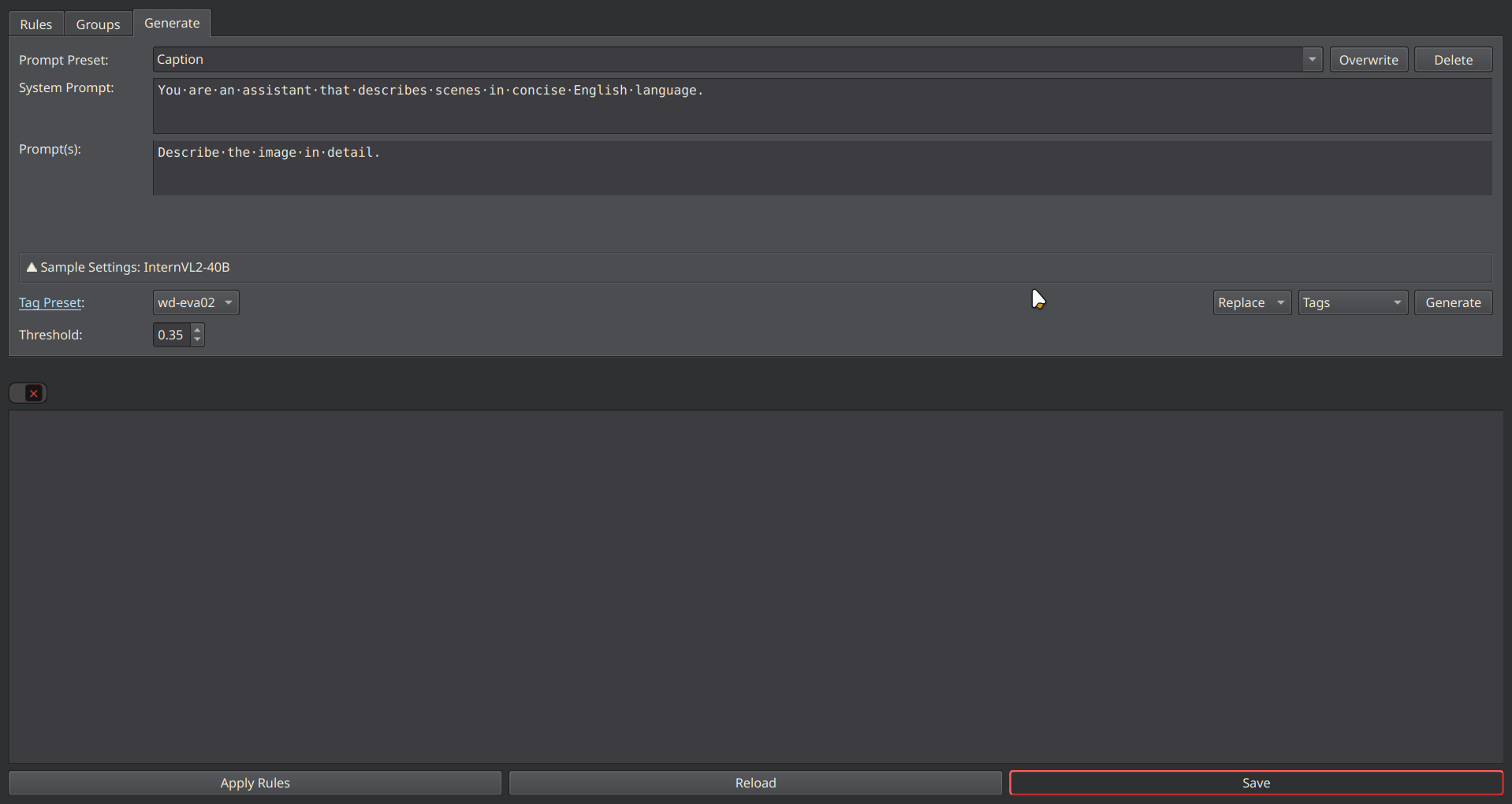 Transform existing captions/tags.- Models in GGUF format with embedded chat template (llama-cpp backend).