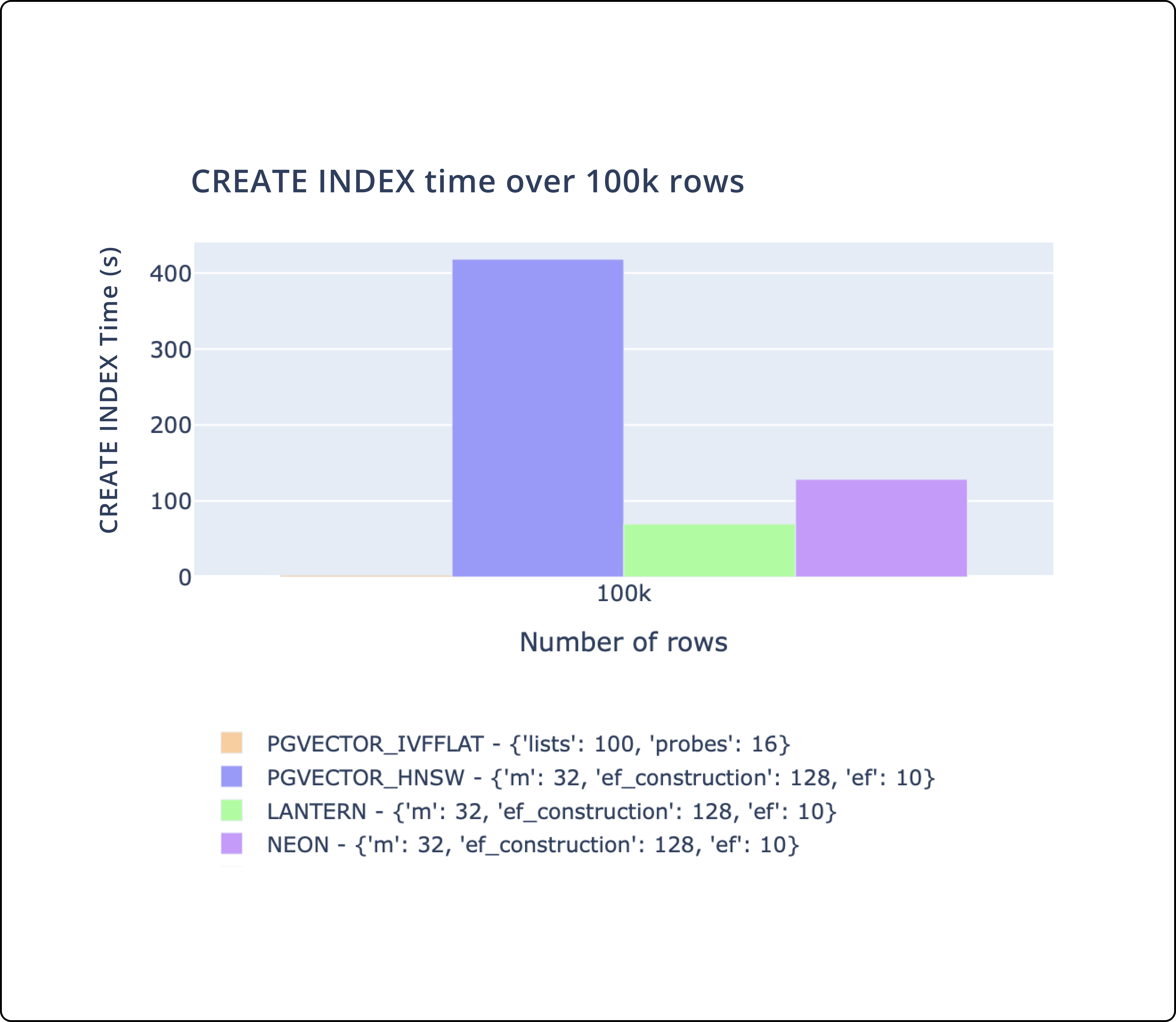 CREATE INDEXtime,SELECTthroughput, andSELECTlatency. - We match or outperform pgvector and pg_embedding (Neon) on all of these metrics.
