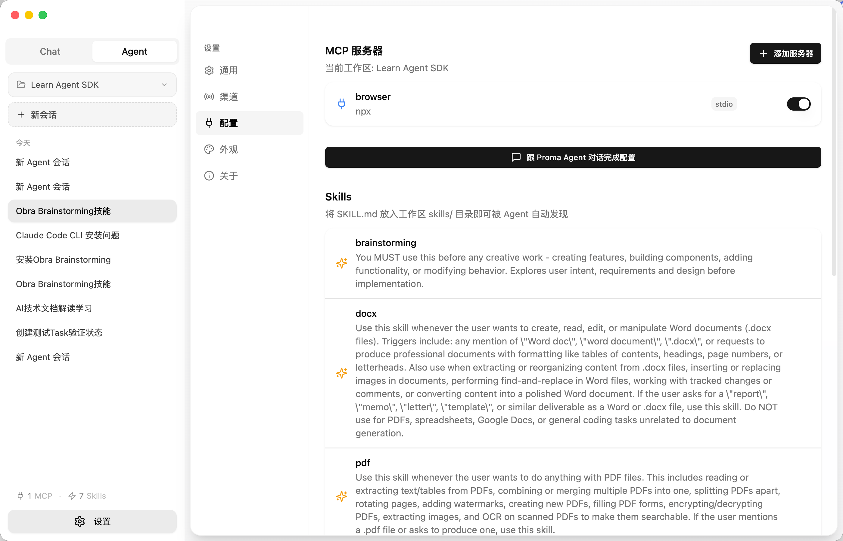 Agent 模式需要一个 Anthropic 渠道。添加后,进入 设置 > Agent 选择你的 Anthropic 渠道和模型(推荐 Claude Sonnet 4 / Opus 4)。底层使用 Claude Agent SDK。
