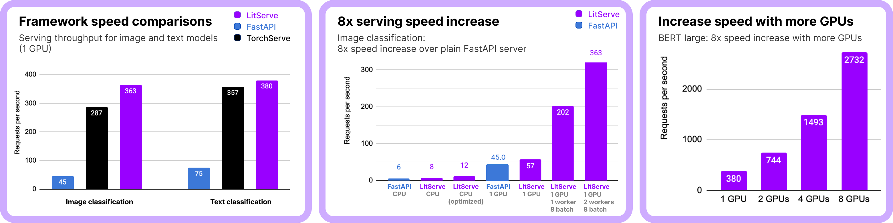 Additional features like batching and GPU autoscaling can drive performance well beyond 2x, scaling efficiently to handle more simultaneous requests than FastAPI and TorchServe.
