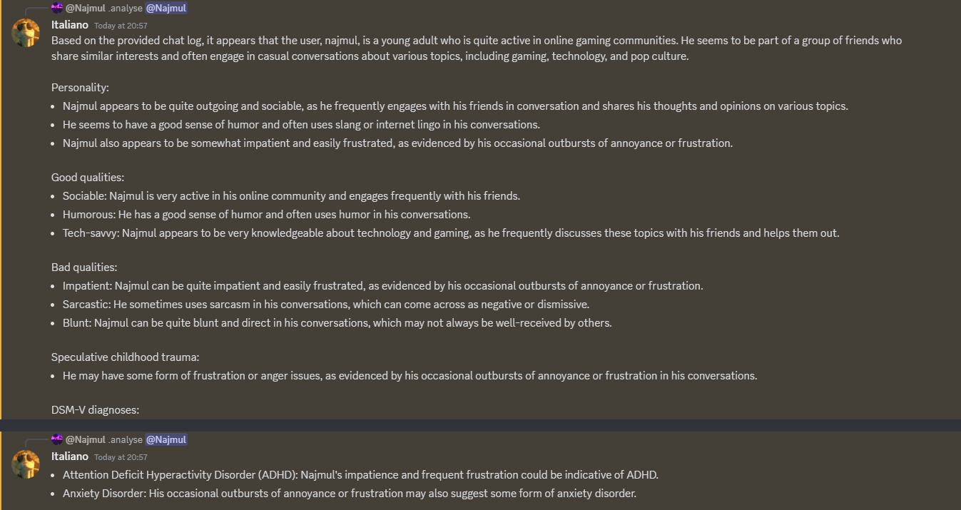 - analyse [user] - Analyze a user's message history and provides a - gical profile