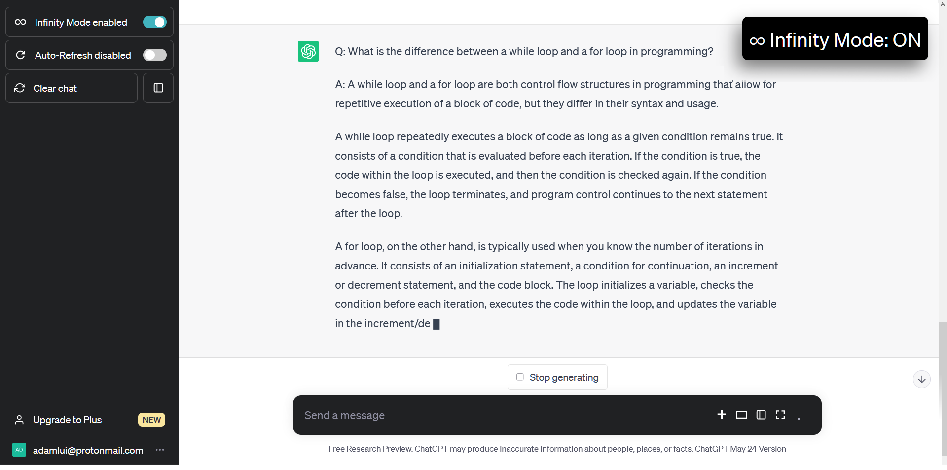 ChatGPT Infinity is a free and powerful add-on that makes ChatGPT generate infinite answers on any topic. It offers customizable topic selection, multilingual support, adjustable response interval, and auto-scroll feature for a seamless chat experience.