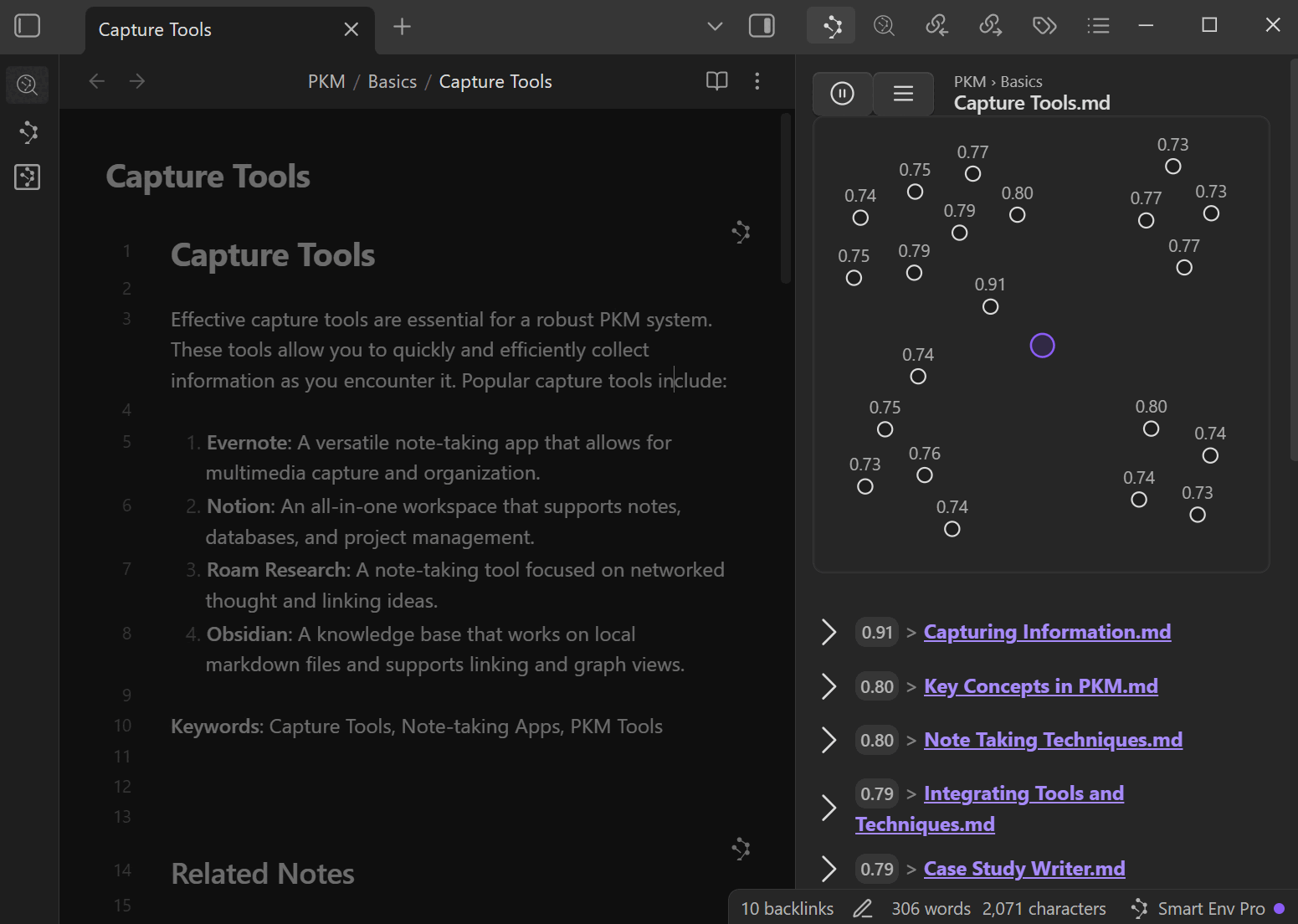 - "Smart Connections is so cool. I'm noticing similarities between notes that talk about the same thing but don't share any words."