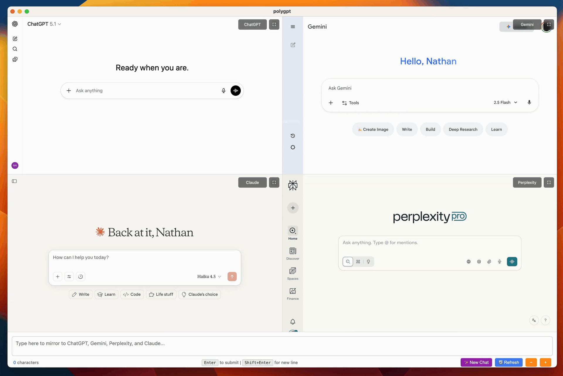 - 4-way split view - ChatGPT, Claude, Gemini, and Perplexity in a 2x2 grid