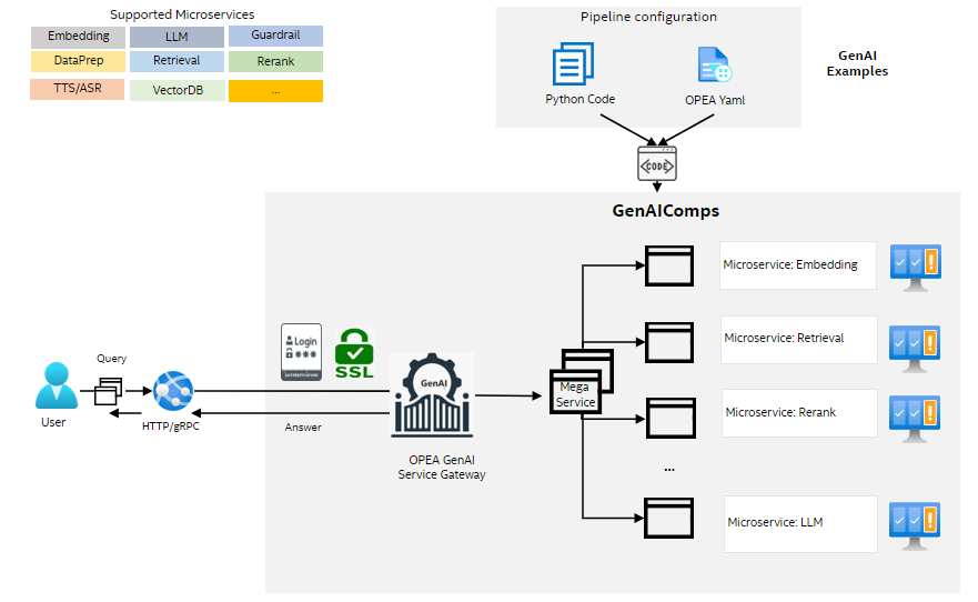 GenAI components at micro-service level; GenAI service composer to create mega-service