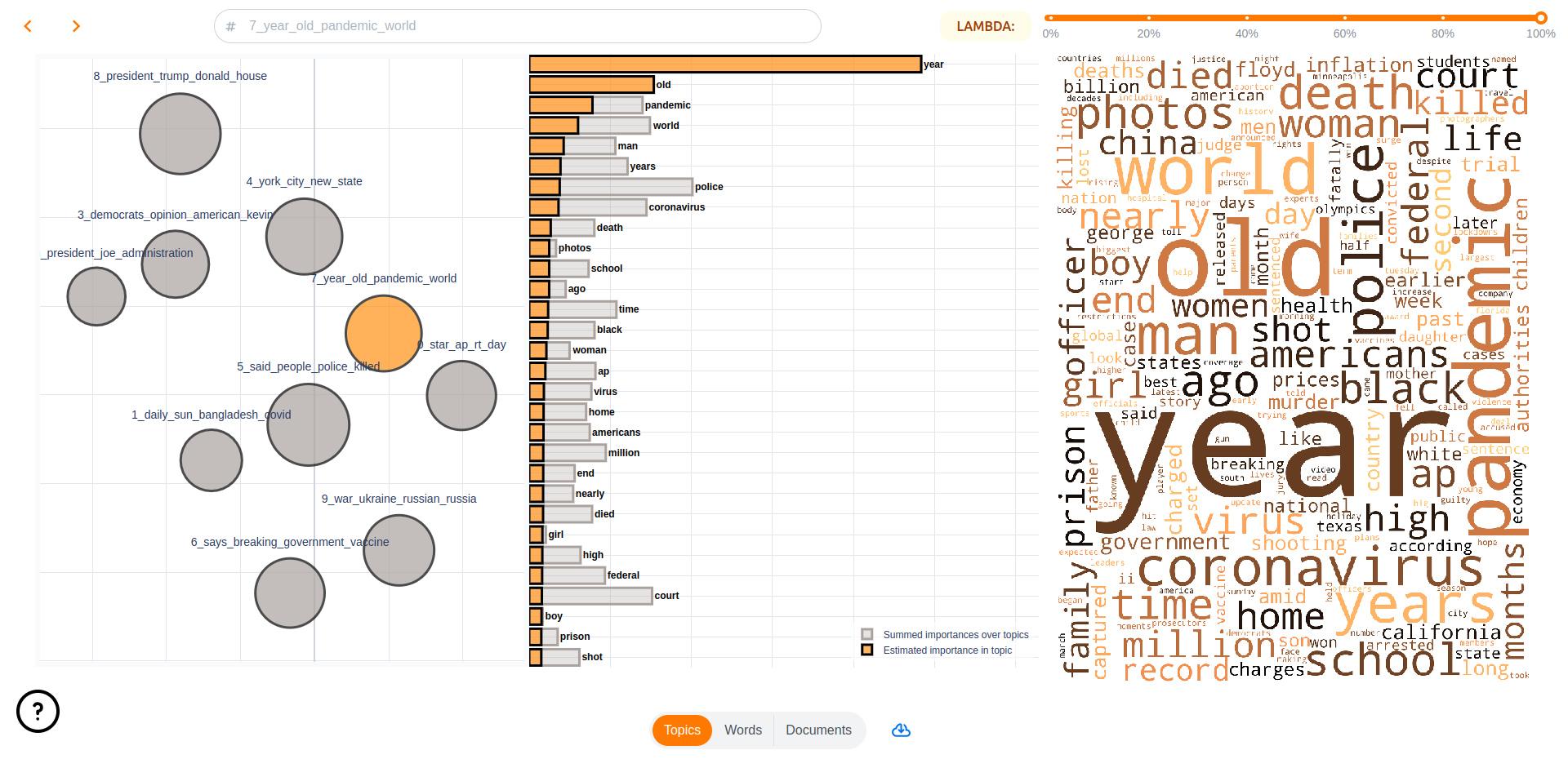 pip install "turftopic[topic-wizard]"By far the easiest way to visualize your models for interpretation is to launch the topicwizard web app.